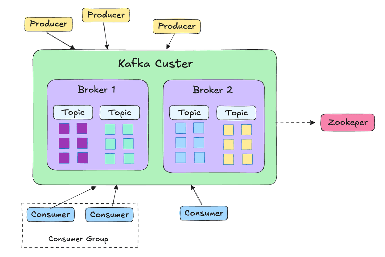 ZooKeeper: ZooKeeper is a centralized service for maintaining configuration information, naming, providing distributed synchronization and group services. In Kafka, ZooKeeper is used to manage and coordinate Kafka brokers. ZooKeeper is presented as a separate component that interacts with the Kafka cluster.